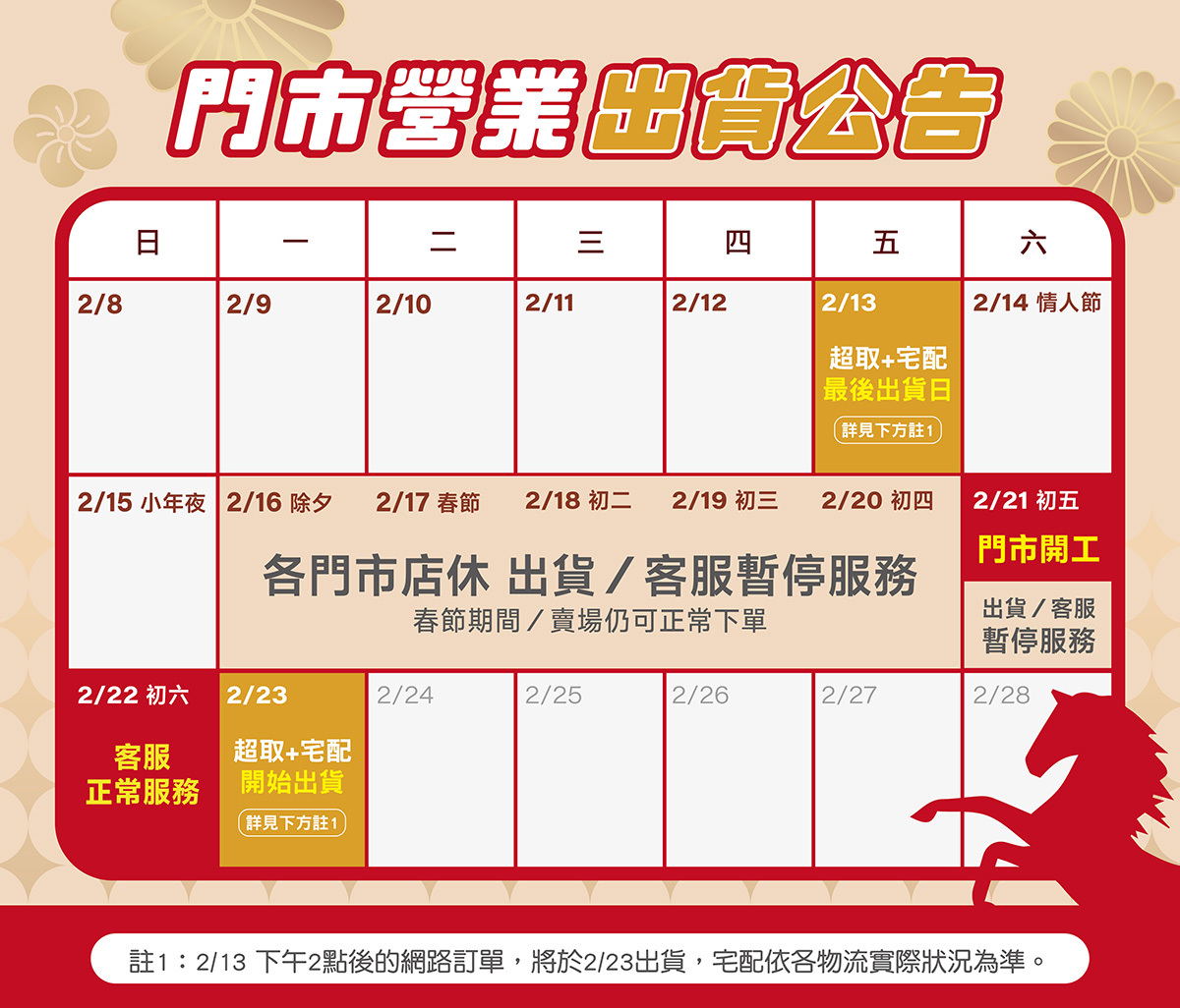 註1:2/13 下午2點後的網路訂單,將於 2/23 陸續出貨。