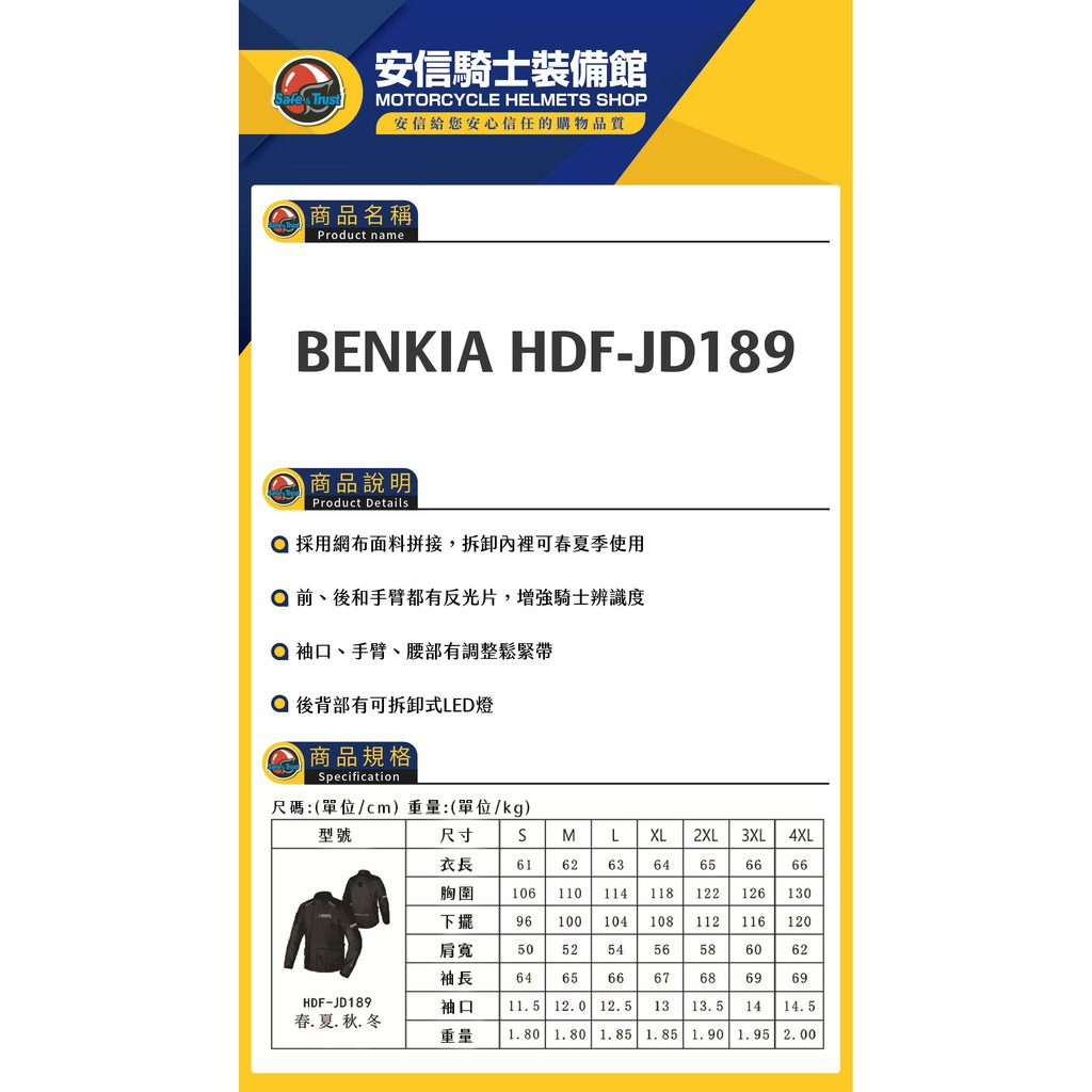 BENKIA HDF-JD189 四季 防水防風保暖防摔衣 JD189