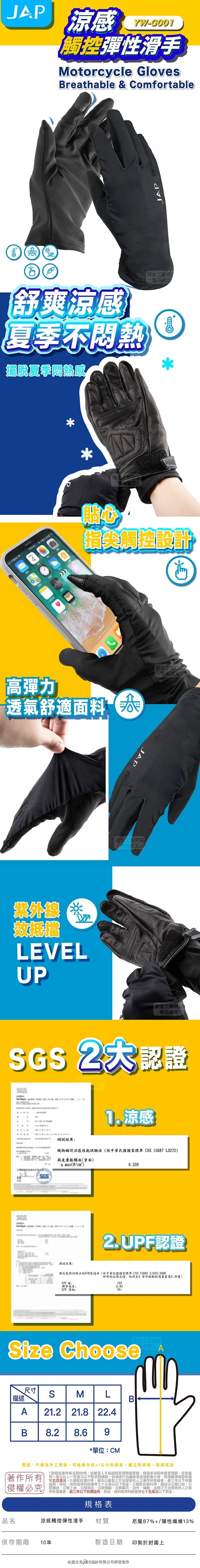 JAP YW-G001 滑手 黑 涼感 可觸控 彈性 騎士手套 YWG001