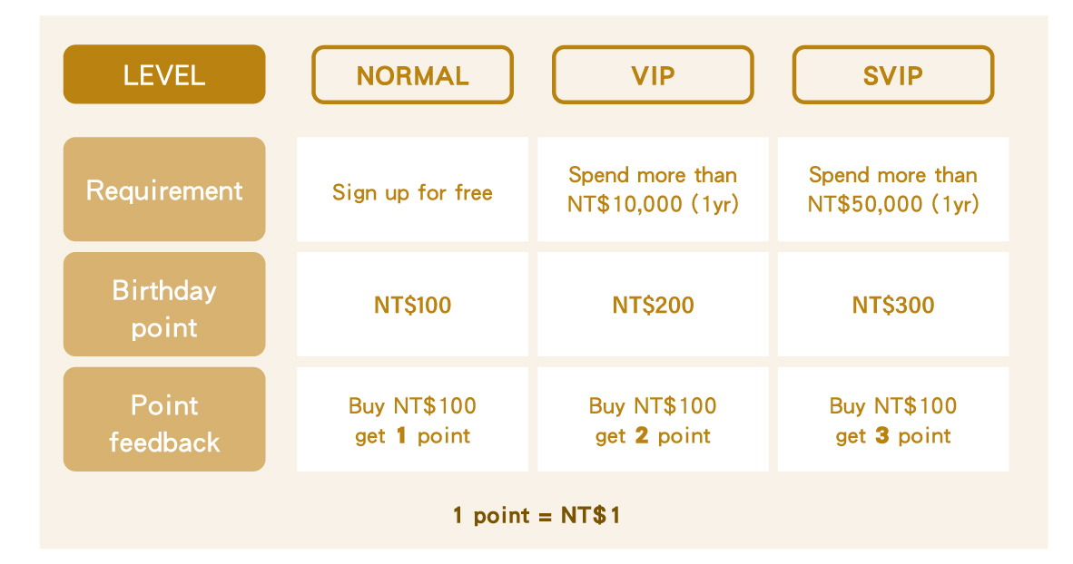 ※You can get points when you spend NT$100, 1 shopping point = NT$1.