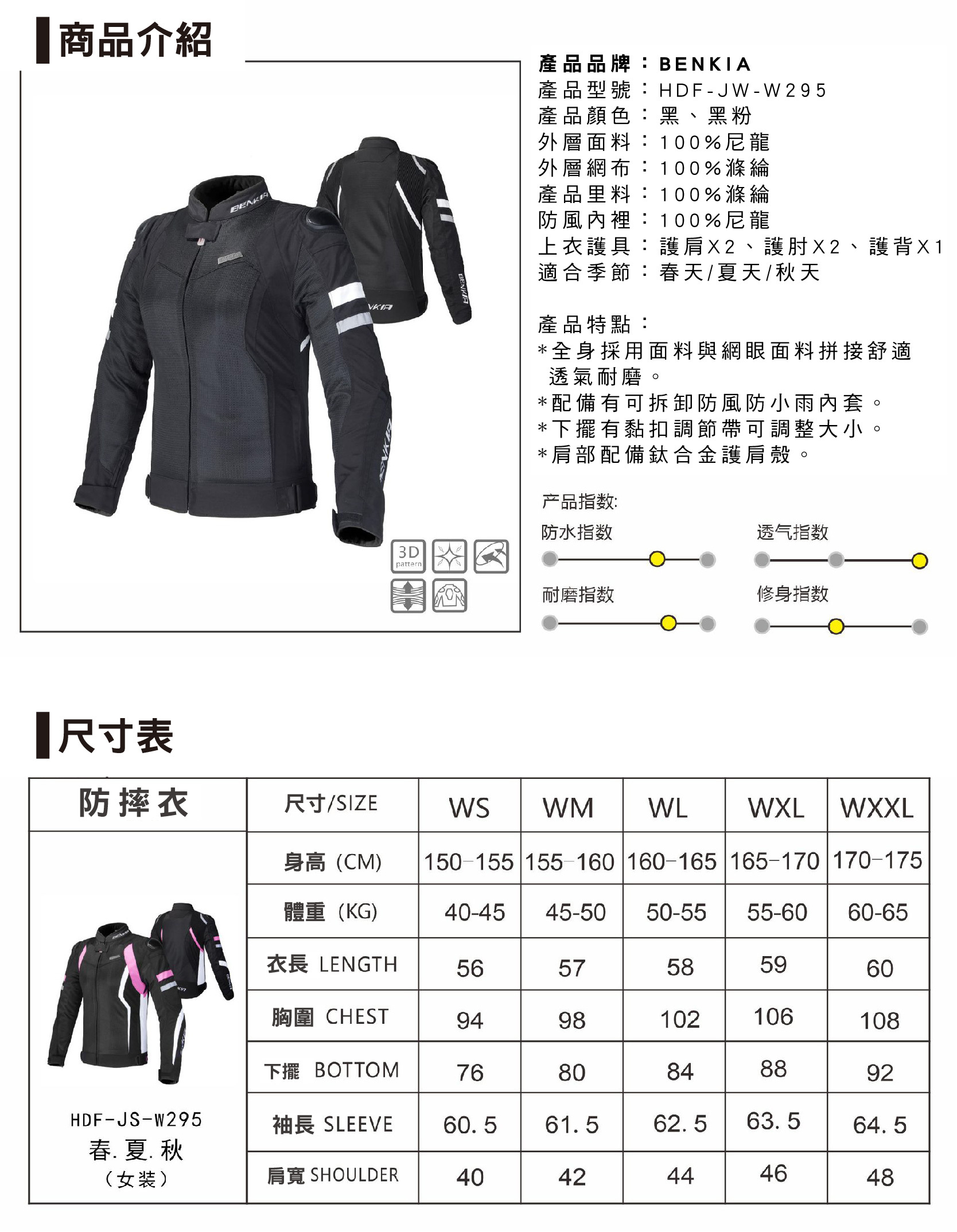 BENKIA HDF-JW-W295 女款 防摔衣 網眼透氣 耐磨 五件護具 騎士 外套 JWW295