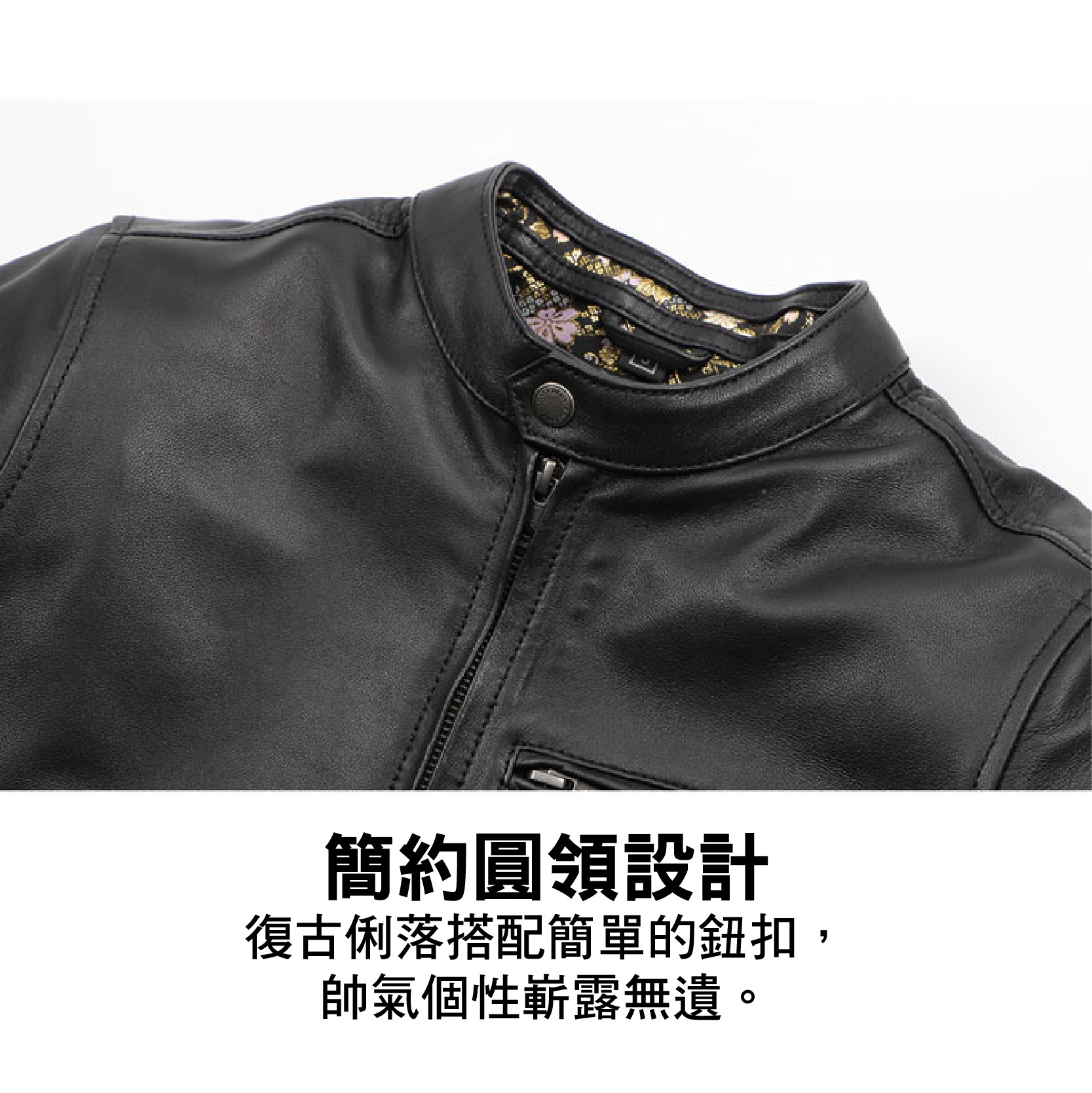 .簡約圓領設計,復古俐落搭配簡單的鈕扣,帥氣個性嶄露無遺。
