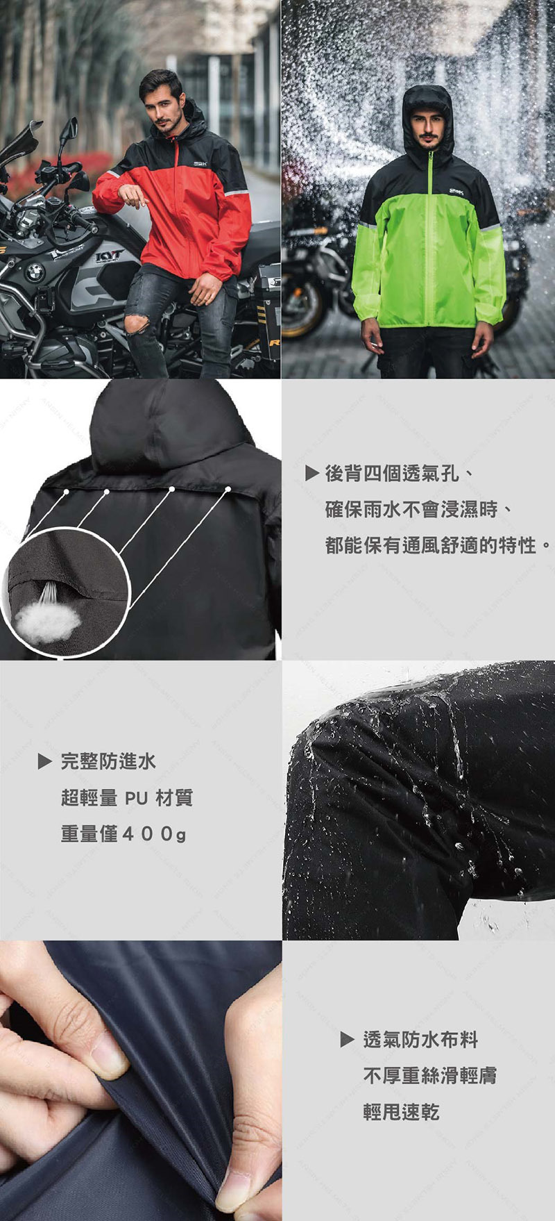 超輕量 PU 材質重量僅400g 、直接透氣防水布料不厚重絲滑輕膚、輕甩速乾。